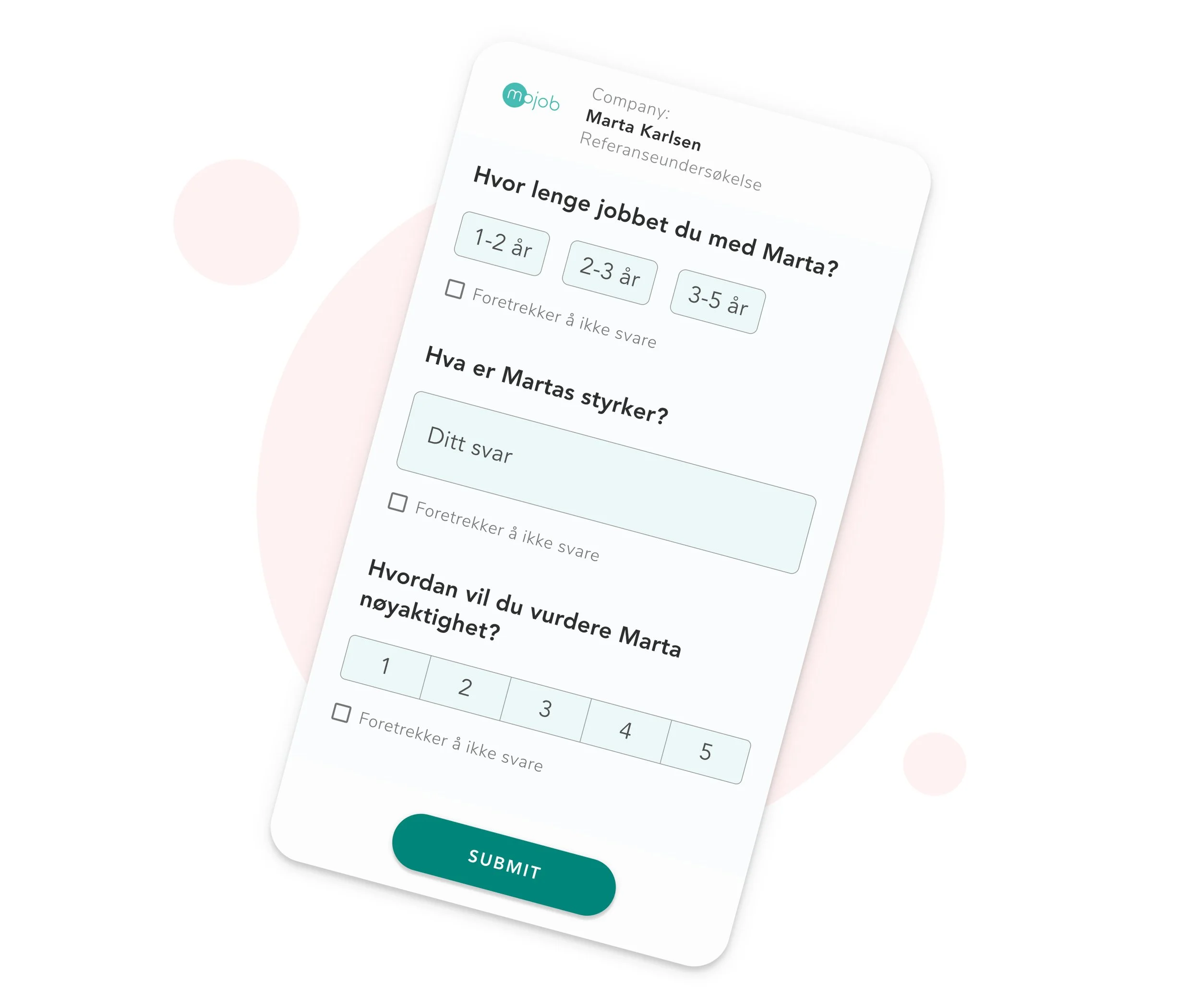 Mojob ber automatisk talenter om å oppgi sine referanser. Deretter vil referansepersonene automatisk få en invitasjon til å svare på referansespørsmål, digitalt eller trykke på alternativ for å bli oppringt. Underveis oppdateres en referansesjekk-rapport i sanntid for hver talentprofil.