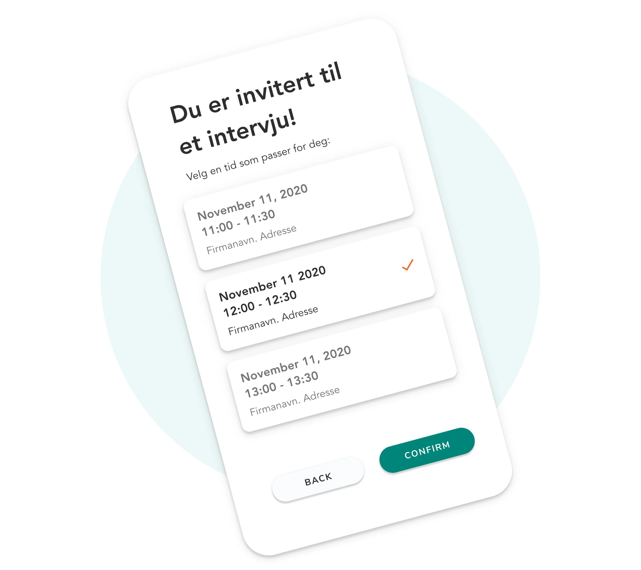 La kandidater enkelt velge tilgjengelige tidspunkt og deretter få automatisk tilsendt møteinnkalling (fysisk eller nettmøte)